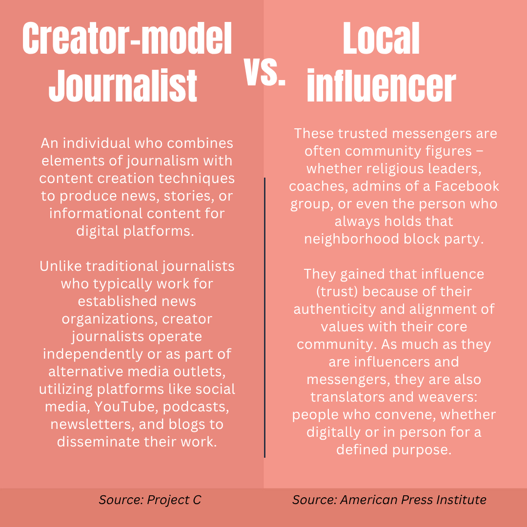Bottom line: By investing in creator-model journalists alongside legacy institutions, funders can strengthen the full spectrum of local news and information, ensuring communities are better informed, more connected, and more resilient.